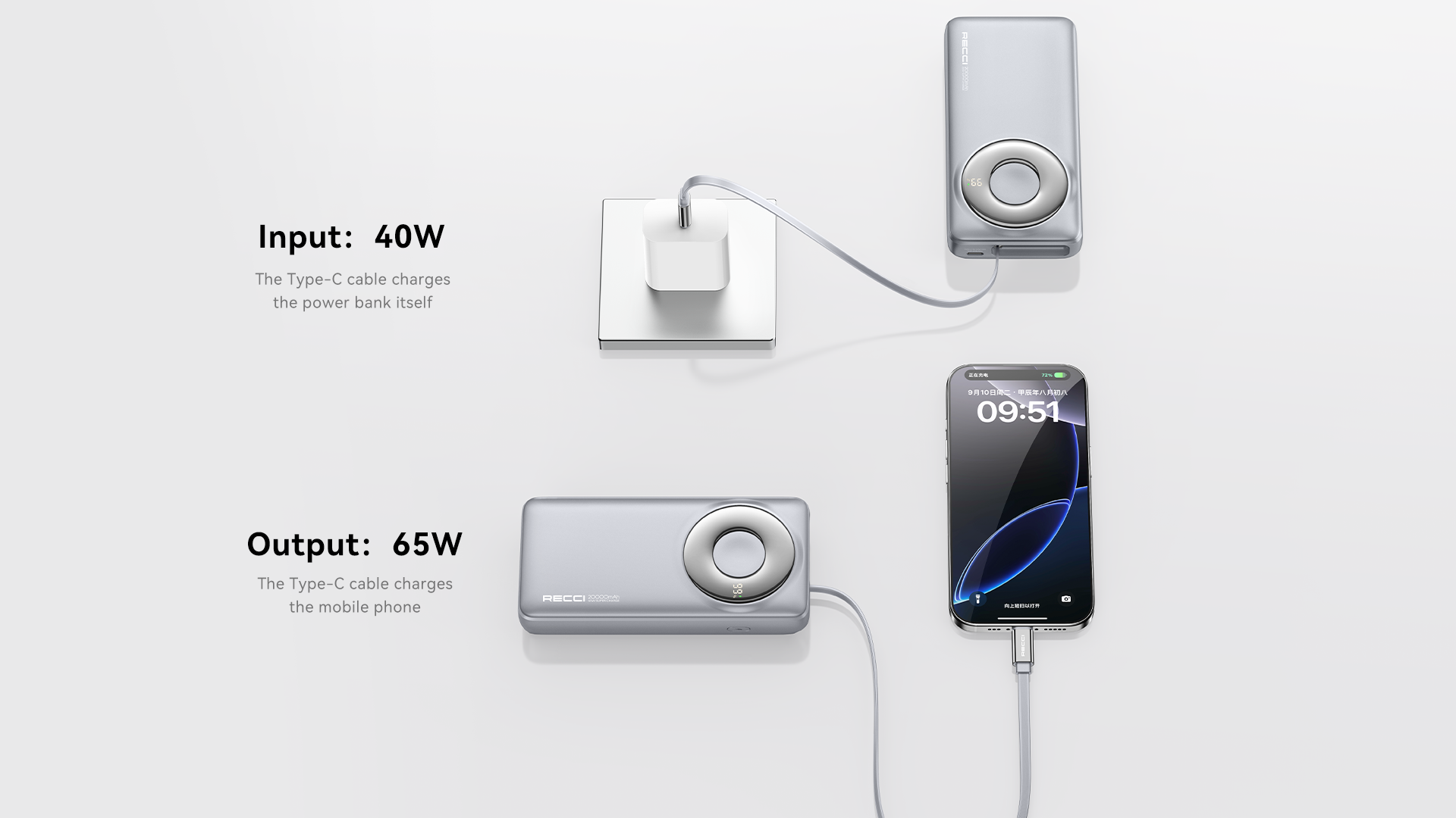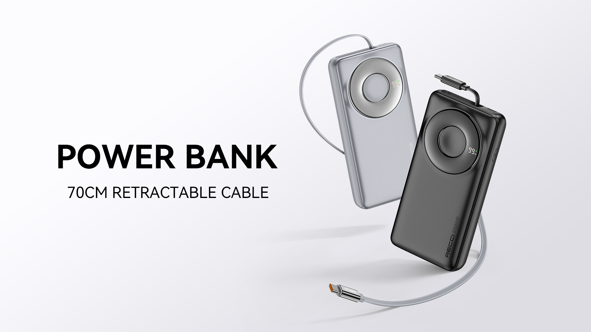 پاور بانک ۲۰۰۰۰ میلی آمپر۲×۶۵ وات (دارای دو درگاه ) سوپر فست با کابل جمع شونده برند RECCI مدل RPB-P72